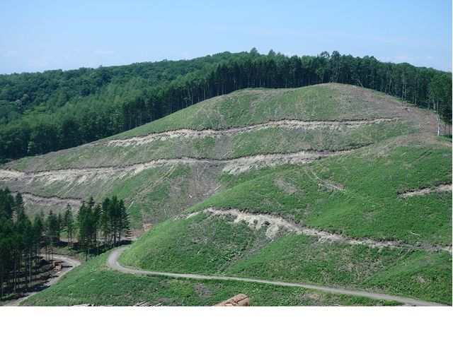 森林の伐採後は、跡を均し、苗木を植え易くするための地拵えという作業を行います。